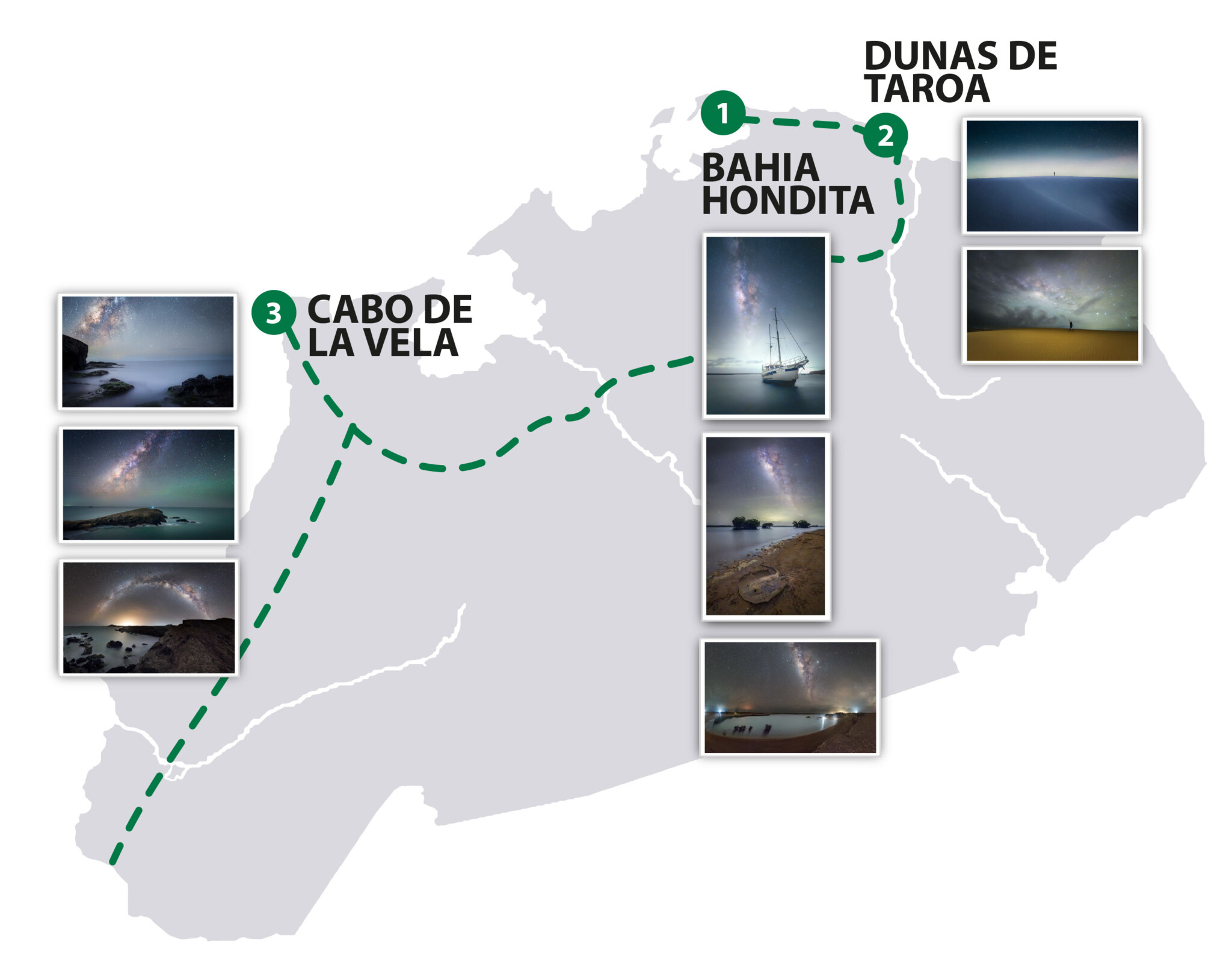 Te imaginas caminar por unas dunas que conectan con el mar en el día y en la noche?. Pues es la actividad siguiente. Prepárate para vivir una de las más grandes experiencias de este viaje, el realizar un scouting por las Dunas de Taroa para capturar este mágico lugar con los colores del atardecer y la magia de las estrellas en la noche, una experiencia sin igual. En esta zona vamos a aprovechar para trabajar con avanzadas técnicas fotográficas de la mano de nuestro fotógrafo experto en el area. Nuestra cena será cerca de las Dunas para mayor facilidad y poder tener un rango largo de tiempo para hacer fotografías previo a regresar a las 11pm a la posada Luzmila para descansar. Sin embargo, si deseas continuar haciendo fotografías en Bahía Hondita eres totalmente libre de hacerlo. ;).  Fin día 2